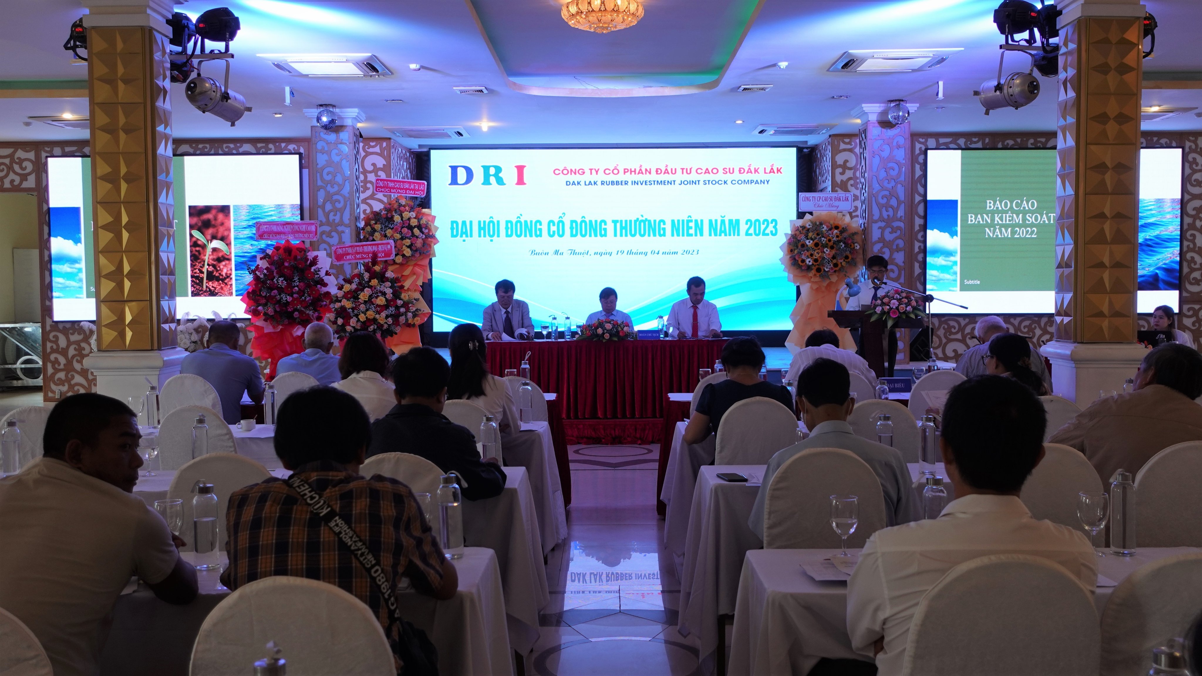 Ngày 19/04/2023, Công ty Cổ phần Đầu tư Cao su Đắk Lắk (DRI) tổ chức Đại hội đồng cổ đông thường niên năm 2023 tại Khách sạn Dakruco, địa chỉ 30 Nguyễn Chí Thanh, Phường Tân An, Thành phố Buôn Ma Thuột, Tỉnh Đắk Lắk, với sự có mặt 24 cổ đông tham dự và ủy quyền, đại diện cho 49.675.008 cổ phần có quyền biểu quyết chiếm 67,86% tổng số cổ phần của công ty DRI.