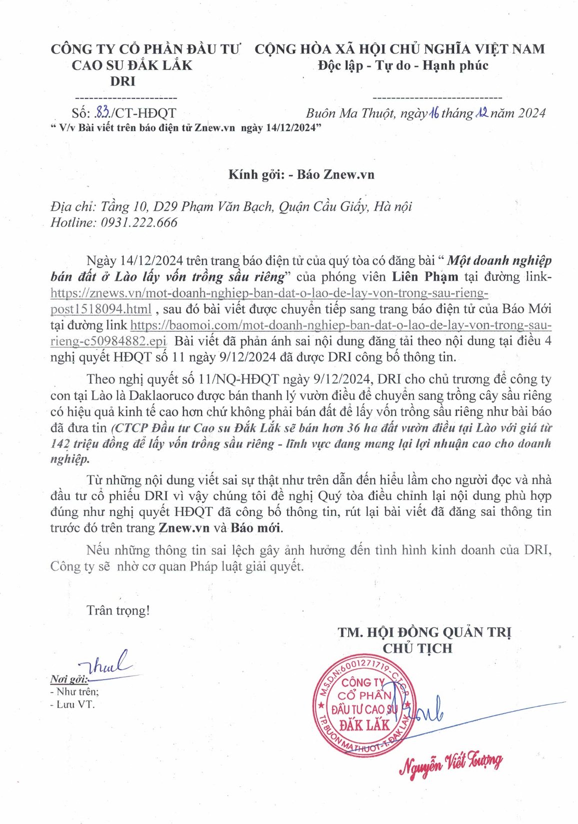 Công ty CP Đầu tư Cao su Đắk Lắk công bố Nghị quyết số 11/NQ-HĐQT ngày 09/12/2024 lấy ý kiến thành viên HĐQT lần thứ 7 năm 2024.